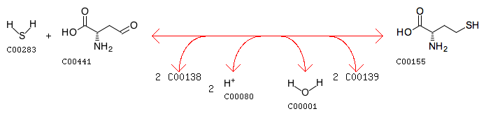 Hydrogen sulfide + L-Aspartate 4-semialdehyde + 2 Reduced ferredoxin + 2 H+ <=> L-Homocysteine + H2O + 2 Oxidized ferredoxin