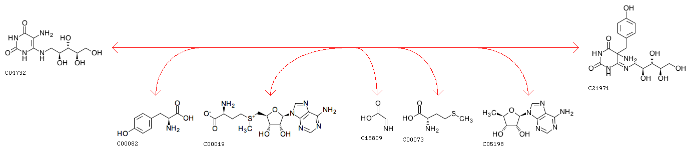 R12161 5-Amino-6-(1-D-ribitylamino)uracil + L-Tyrosine + S-Adenosyl-L-methionine <=> 5-Amino-5-(4-hydroxybenzyl)-6-(D-ribitylimino)-5,6-dihydrouracil + Iminoglycine + L-Methionine + 5'-Deoxyadenosine