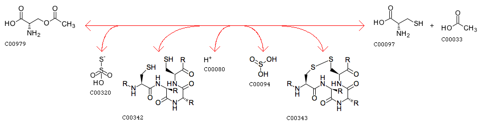 R04859 O-Acetyl-L-serine + Thiosulfate + Thioredoxin + H+ <=> L-Cysteine + Sulfite + Thioredoxin disulfide + Acetate